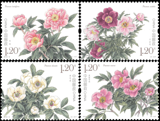 中国邮政于2019年5月11日发行了《芍药》特种邮票1套4枚,邮票图案名称分别为:芍药、川赤芍、草芍药、美丽芍药。