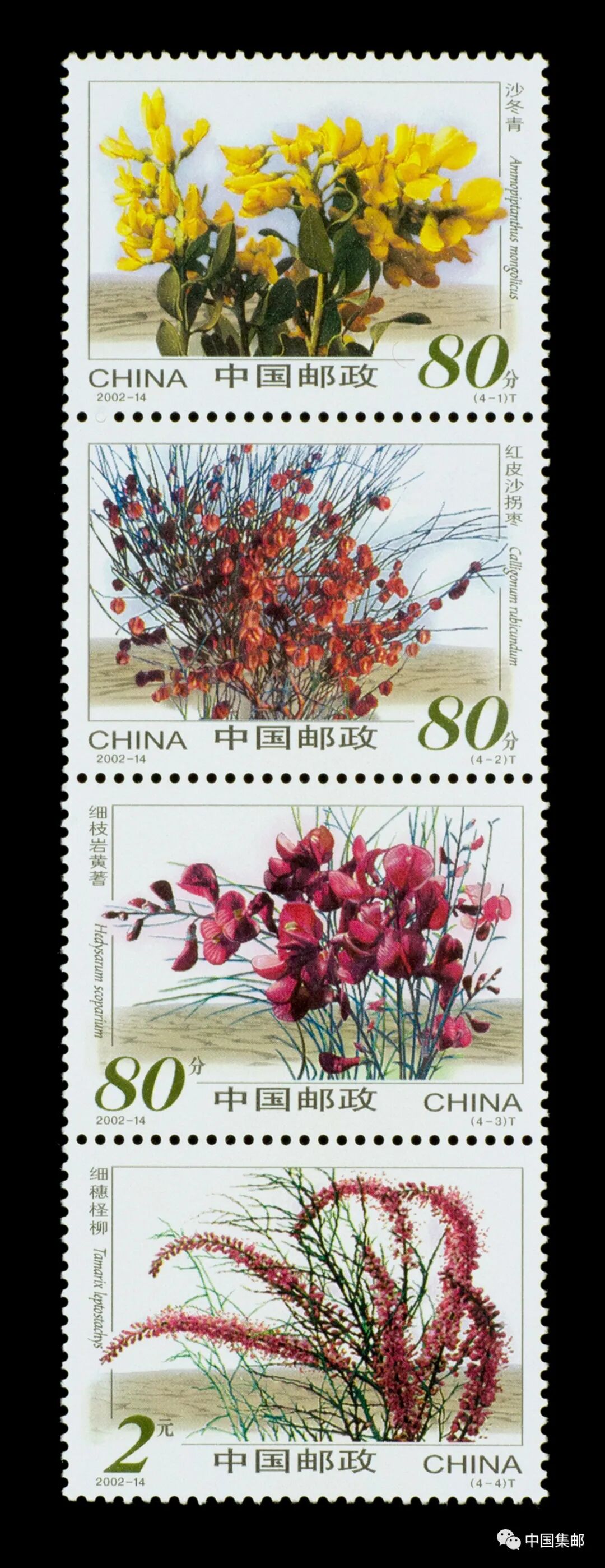 为了宣传治理沙漠的重大意义,2002年6月29日,中国邮政又发行了《沙漠植物》特种邮票,全套4枚。邮票表现的四种沙漠植物分别是:沙冬青、红皮沙拐枣、细枝岩黄蓍和细穗柽柳,这些沙漠植物在宁夏防风固沙、绿化荒漠中同样起到了重要作用。