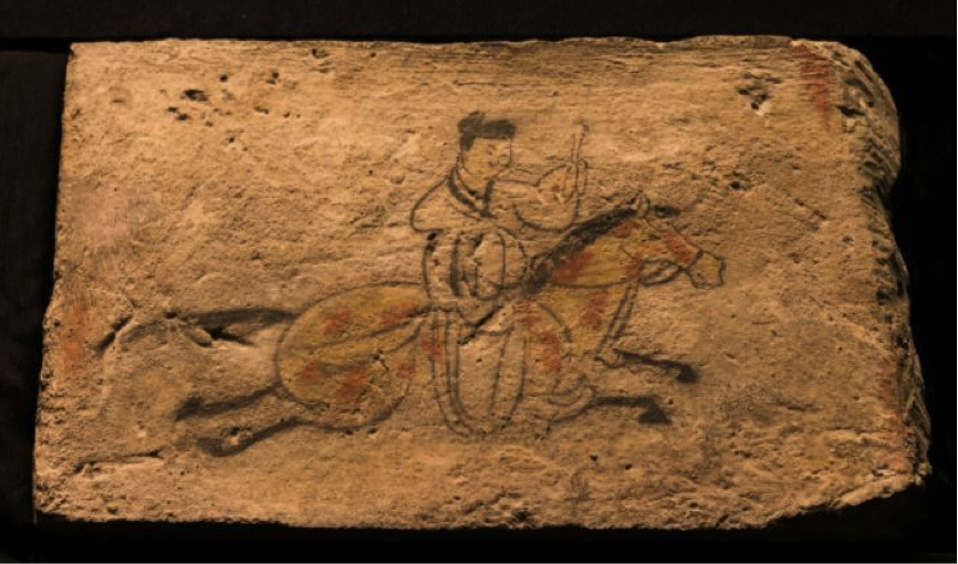 1972年于嘉峪关市新城魏晋5号壁画墓出土,砖面横35公分,纵17公分,以彩绘和黑色勾线描画了一位疾行驿使,被文物部门命名为“驿使图”。画像砖上的驿使头戴黑帻,着皂缘领袖中衣,左手持棨传文书,胯下红鬃马四蹄腾空,表现了驿使跃马疾驰。棨传为通过关卡、驿站时的信物。这是目前发现的最早驿使形象,距今已有一千七百年左右。