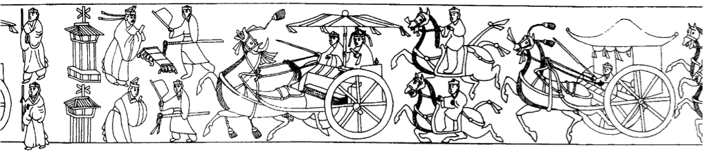 汉画像石上的“车马临门图”,表现了两位专职人员,将传车迎进中继站点——传舍,以利信使作安全、正点的长途旅行。