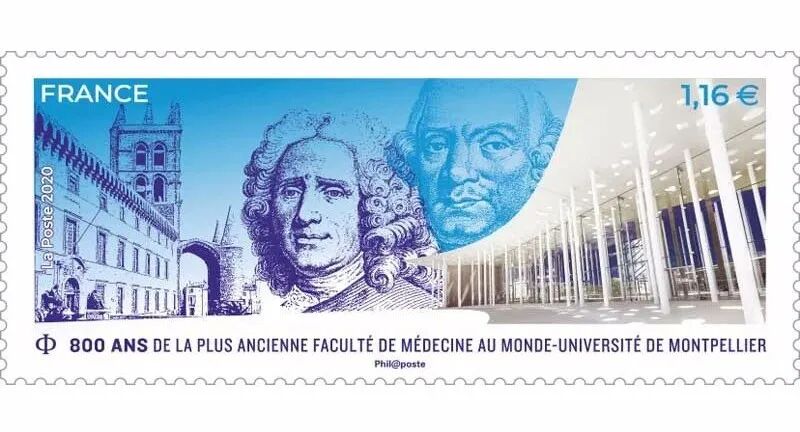 2020年6月15日,法国邮政为蒙彼利埃大学医学院建院800周年发行一枚纪念邮票。蒙彼利埃大学成立于1289年,是世界上最古老的大学之一。1220年,这里创办了慈善性医学机构——蒙彼利埃医学院,这是法国最早的医科学校,也是蒙彼利埃大学的前身。