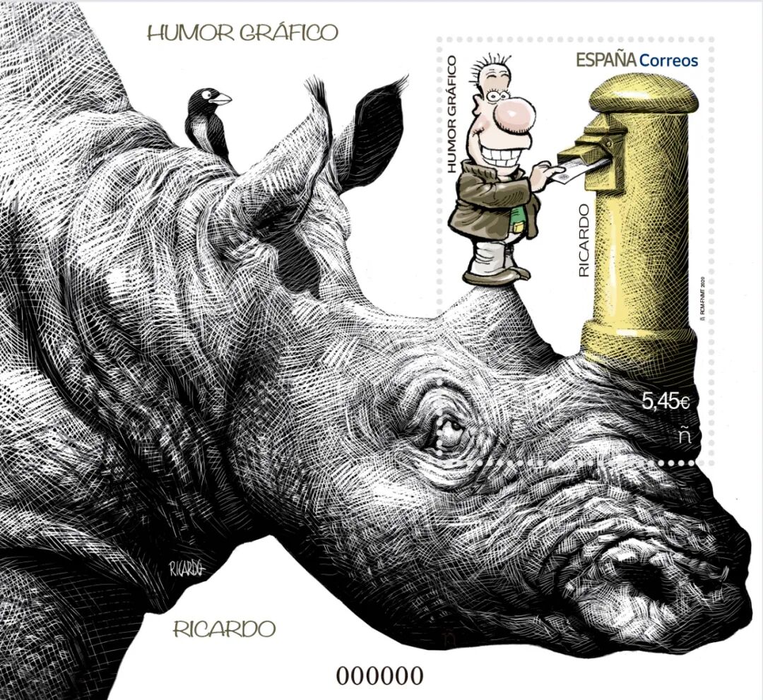 2020年6月12日,西班牙邮政发行一枚《幽默》系列小型张,选用了插画大师Ricardo Martínez(1956— )的作品。这位大师出生在智利,1969年移民西班牙,自学绘画,细节刻画得细腻动人,线条和光影把握堪称极致。