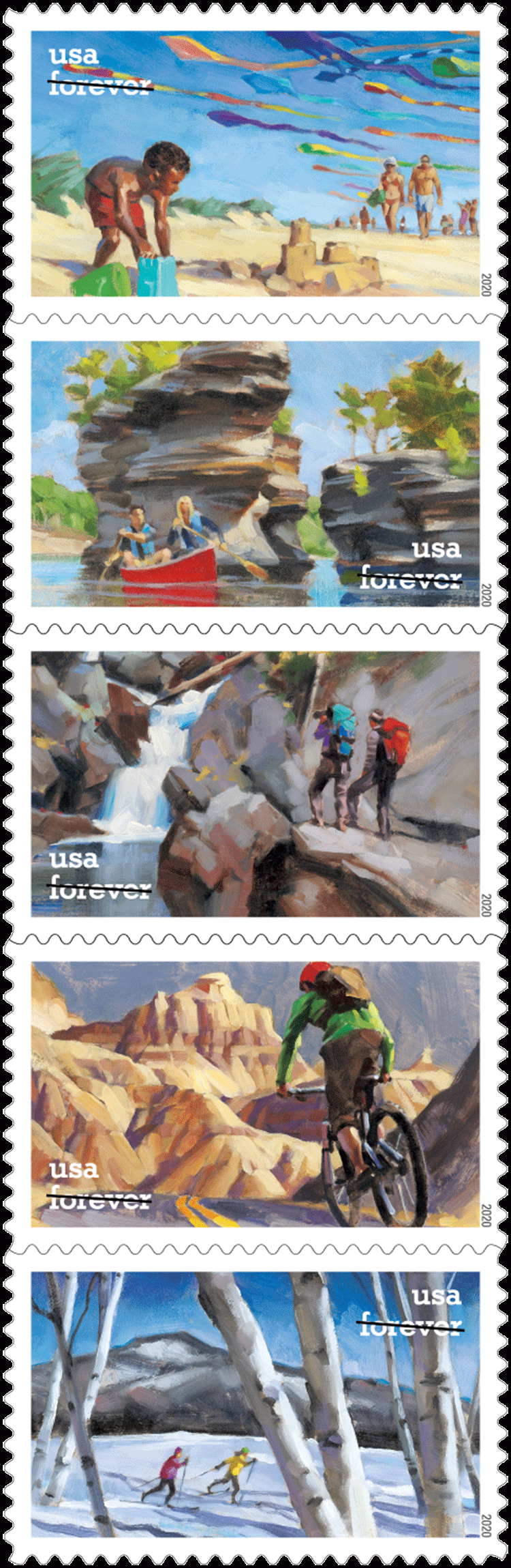 2020年6月13日,美国邮政发行一套五枚《亲近大自然》邮票,沙滩、划艇、登山、自行车和滑雪,让大家多么地怀念疫情之前的轻松时代,那时,还没有居家令。