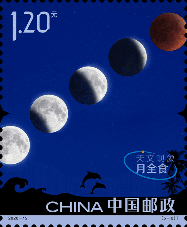 月全食邮票中,夜光墨的使用来表现满月到月全食过程中不同亮度的月光效果。