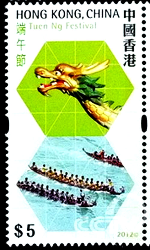 2012年5月22日,香港邮政发售“香港节日”特别邮票一套4枚,其中第四枚邮票为“端午节” ,图案中上下两个正六边形,上为龙舟头的特写,下为龙舟竞技的热烈场面;邮票用色清新悦目,凸显端午节的传统习俗。