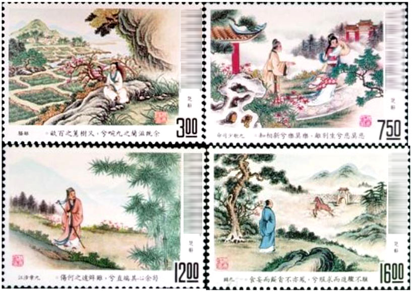 1989年6月7日端午节前一天,台湾邮政发行了《中国古典诗词邮票—楚辞》邮票一套4枚,图案以诗画形式表现了屈原《楚辞》中的四大代表性名作,分别为《离骚》《九歌·少司命》《九章·涉江》和《九辩》。