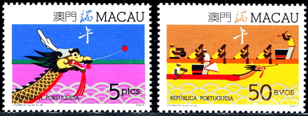 澳门邮政于1987年5月29日发行《端午节》邮票一套2枚,以龙舟为表现题材,主图分别为“龙舟龙头”与“龙舟竞渡”。邮票上印有“澳门”“端午”字样。票面上龙舟龙头的形象大气威武,龙舟竞渡的场面热闹非凡。这也是澳门首套出现中文铭记的邮票。