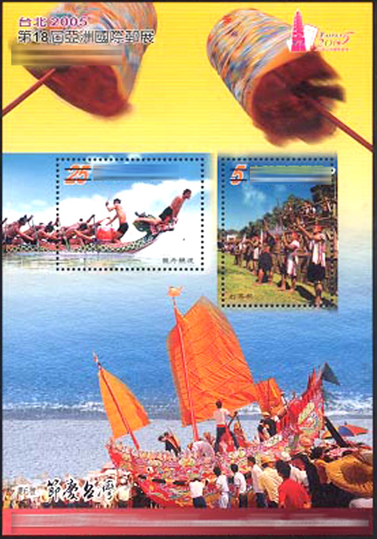 台湾邮政于2004年8月27日,以2005年第18届亚展为题,发行《节庆·台湾龙舟》小全张1枚,“打耳祭”和“龙舟竞渡”分别为两枚邮票主图。其中“划龙舟”原系祭水神的仪式,旨在消灾祈福,今日已成为端午节最受欢迎的民俗活动之一。