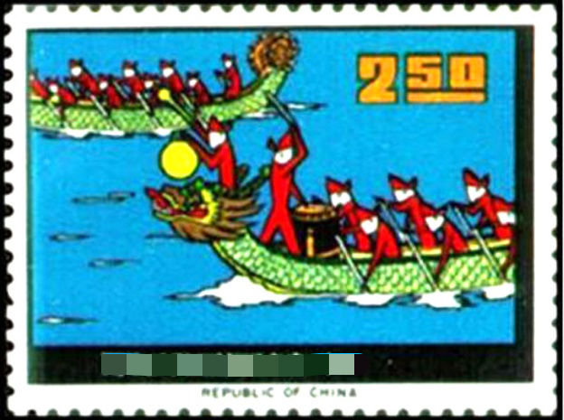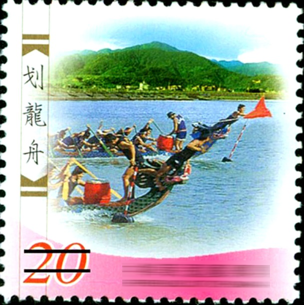 台湾邮政于2002年2月26日发行的《台湾民俗活动邮票》上辑,以"放天灯""放蜂炮""妈祖出巡""划龙舟"为主题,其中第四枚“划龙舟”与端午节有关。此枚"划龙舟"邮票介绍文为:台湾各地的龙舟赛,吸引人群围观。龙舟竞渡除了发扬文化、欢度节庆外,在强身健体、团队精神的训练亦有特殊意义。