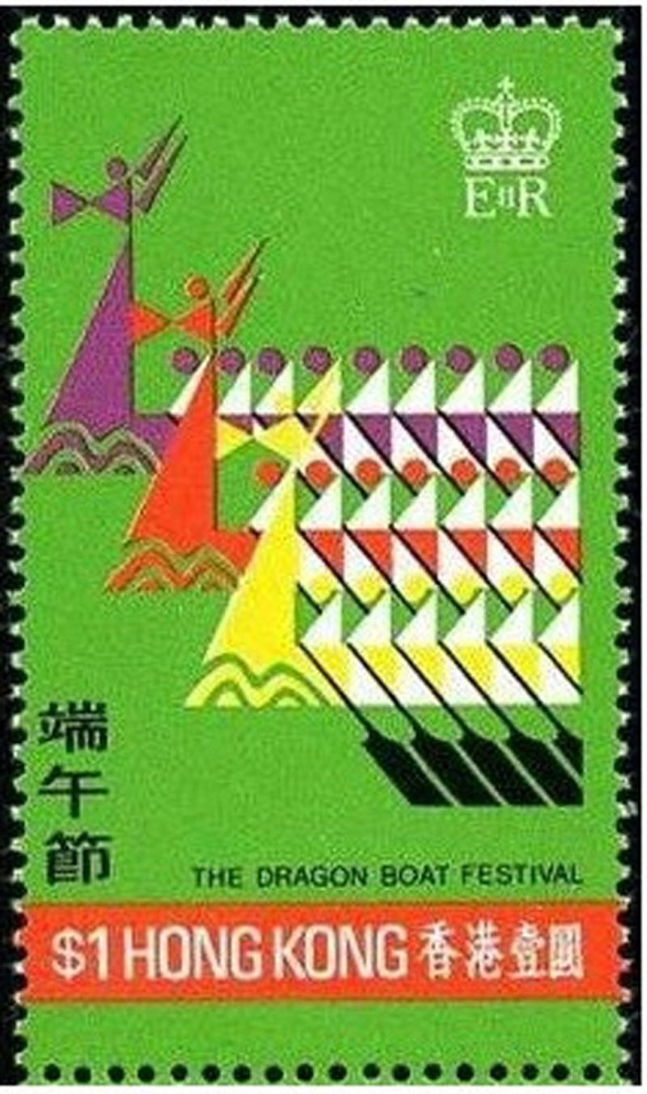 香港邮政于1975年7月31日发行《香港节日》邮票,其中第3枚“端午节”,图案为七巧板拼成的龙舟竞赛活动。