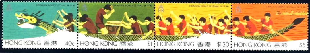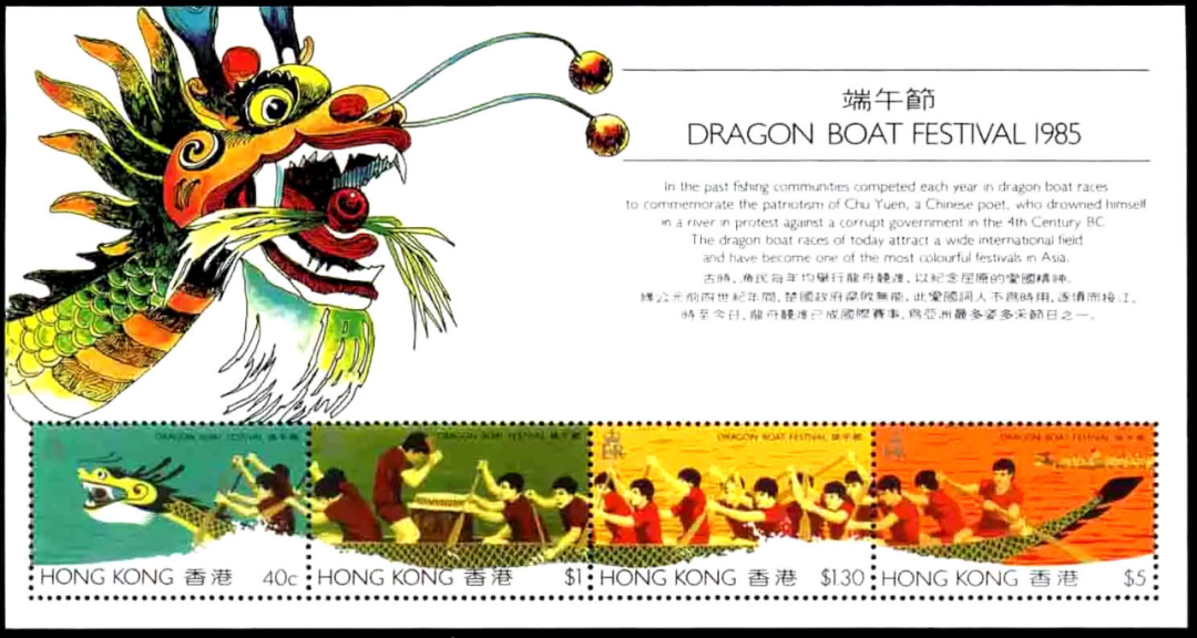 香港邮政于1985年6月22日(端午节)发行《端午节》邮票,全套4枚及小全张1枚,邮票以端午节标志性的龙舟竞渡为图案,4枚邮票首尾相连, 龙头、龙身、龙尾齐全,组成一幅完整的乘风破浪的龙舟竞赛全图景象。