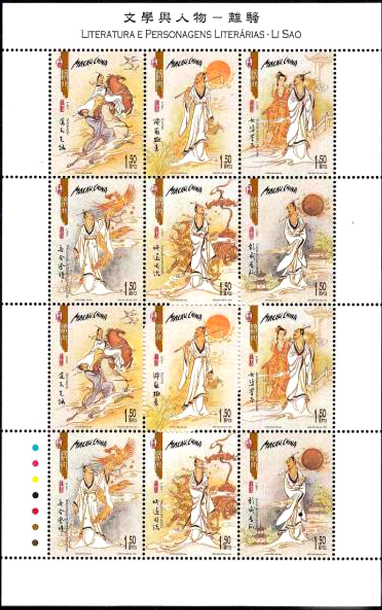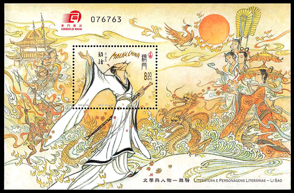 澳门邮政于2004年5月28日发行《文学与人物—离骚》邮票一套6枚,同时推出小型张1枚。此套邮票以中国伟大爱国诗人屈原的诗作《离骚》为主题,诗人浪漫瑰丽的诗句在方寸之间得到体现。图案分别描绘出:道夫先路,滋兰树蕙,女媭詈予,吾令凤腾,修远周流,彭咸居所。小型张图案为离骚。