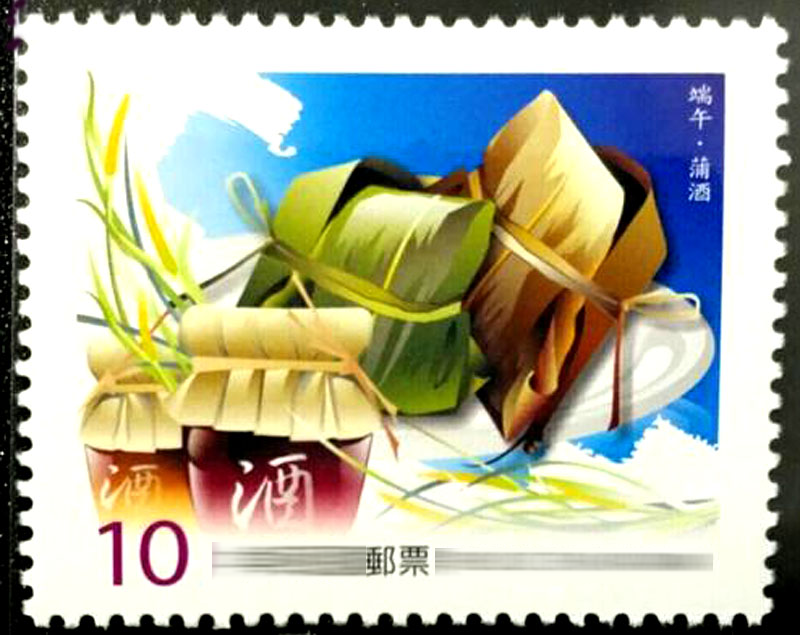 台湾邮政于2012年6月20日特以春节、元宵节、端午节及中秋节为题材发行传统节日邮票1组4枚。此套第3枚"端午蒲酒"邮票描绘出: 划龙舟, 吃粽子是端午节的重要活动, 民间习惯在门上悬挂菖蒲, 艾草等以驱避蚊虫, 佩带香包及饮雄黄酒以祈保平安。