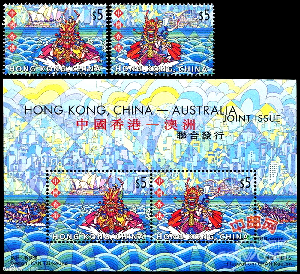2001年6月25日,香港邮政与澳大利亚邮政联合发行了一套2枚《龙舟竞渡》特别邮票,小全张1枚。图案采用中西结合的绘画手法,邮票主图均为挥桨奋进的龙舟健儿,画面再现了赛龙舟夺锦的盛况,洋溢着一片喧腾喜庆的节日气氛,描绘了齐头并进的两只竞渡的龙舟,背景分别为中国香港会展中心新翼和悉尼歌剧院,展示了我国香港和澳大利亚海湾迷人的景色。