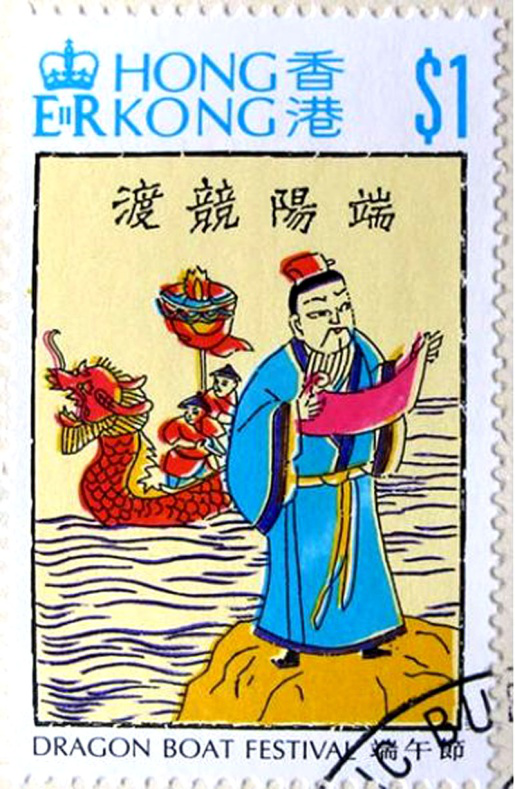 1994年6月8日香港邮政发行的《中国传统节日》邮票,其中表现传统节日端午节的第一枚“端阳竞舟”邮票,图案为中国传统木刻版画端阳竞渡图,以古人划龙舟作背景,前景以手拿诗卷的屈原像为主图,背景为山川与龙舟,并印有“端阳竞渡”字样来点明主题。