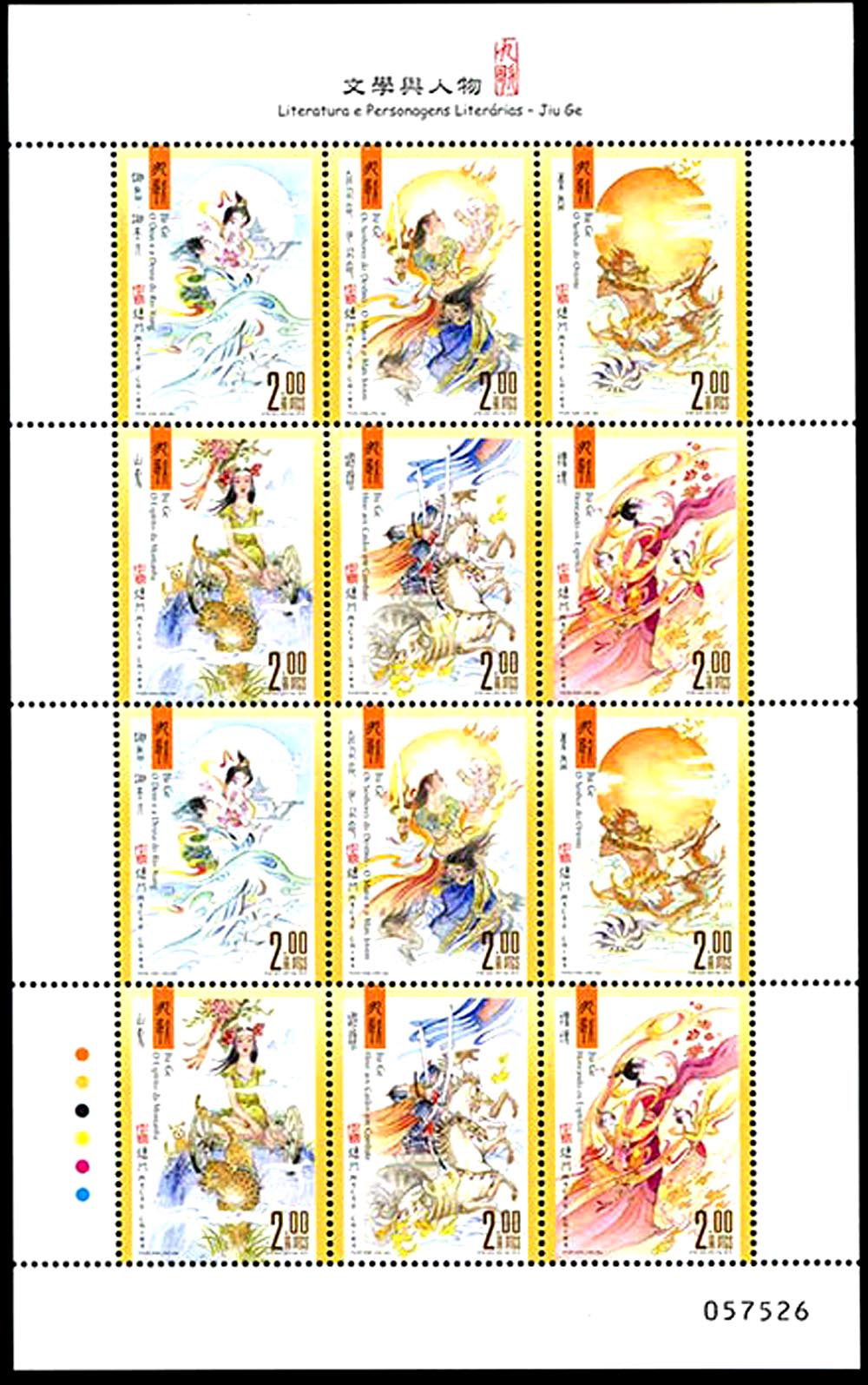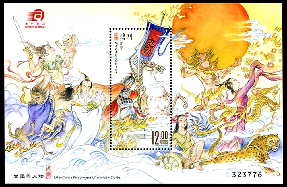 澳门邮政于2015年10月30日发行《文学与人物—九歌》邮票一套6枚,同时推出邮票小型张1枚。