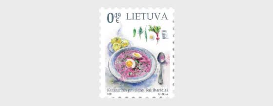 2020年6月19日,立陶宛邮政发行一枚《美食传统》邮票,主题为甜菜冷汤,这是立陶宛的一大特色菜,这种汤看上去是粉红色的,但是绝对不是用颜料所调制出来的,粉红的颜色主要是由红甜菜根和一种当地特有的传统酸奶油调制出来的。这种甜菜冷汤里面有甜菜根丝、黄瓜丝等各种各样的蔬菜,营养丰富。