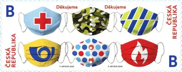 2020年6月24日,捷克邮政发行一套两枚《口罩》普通邮票,向抗疫一线的工作人员表示感谢。这些口罩上的图案代表着消防人员、军警人员和医护人员等战斗在抗疫一线的人员,而那个圆点图案的口罩则代表着相互帮助的每一个人。