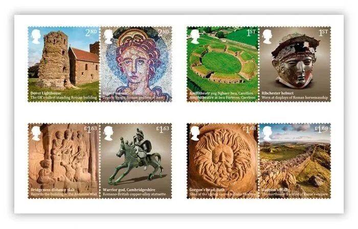 2020年6月18日,英国邮政发行一套八枚《古罗马遗迹》邮票。公元43年,罗马皇帝克劳狄一世率军入侵不列颠,征服不列颠后变其为罗马帝国的行省。到公元409年,罗马驻军被迫全部撤离不列颠,罗马对不列颠的统治即告结束。这次发行的邮票展示了哈德良长城、毕格诺维纳斯马赛克瓷砖、多佛灯塔、卡尔隆圆形剧场、罗契斯特头盔、安敦尼长城、战神雕像和巴斯的美杜莎雕像等。