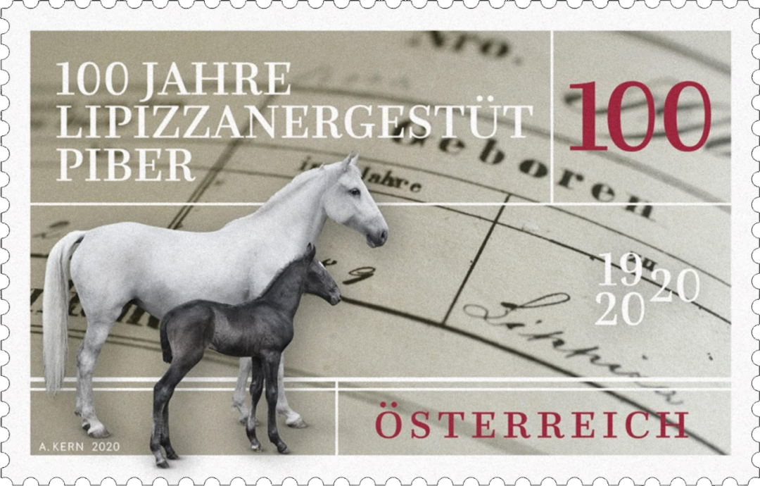 2020年6月20日,奥地利邮政发行一枚邮票,纪念著名的利比萨种马场建立100周年。利比萨种马场位于施泰尔马克州的首府格拉茨。每一匹诞生在这里的小马驹几乎都身负重任,因为它们中的任何一匹都有可能会延续利比萨马的优良基因,成为骑术学校中耀眼的明星。当它们长到6个月就会离开妈妈,接受相关的训练。利比萨马以其纯白高贵的外形颇受世人瞩目,然而,刚刚出生的利比萨马居然是纯黑色的,一般来说,直到它6岁至9岁期间才会完全变成纯白色。