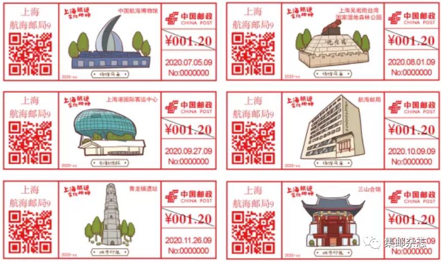 经中国邮政集团有限公司批准,上海航海邮局自2020年7月5日起陆续启用“上海航运文化地标”系列新式邮资机宣传戳第2组。本组邮资机宣传戳共计6枚。启用时间及图案为:7月5日启用“中国航海博物馆”新式邮资机宣传戳;8月1日启用“上海吴淞炮台湾国家湿地森林公园”新式邮资机宣传戳;9月27日启用“上海港国际客运中心”新式邮资机宣传戳;10月9日启用“航海邮局”新式邮资机宣传戳;11月26日启用“青龙镇遗址”新式邮资机宣传戳;12月24日启用“三山会馆”新式邮资机宣传戳。
