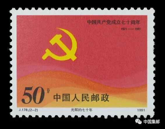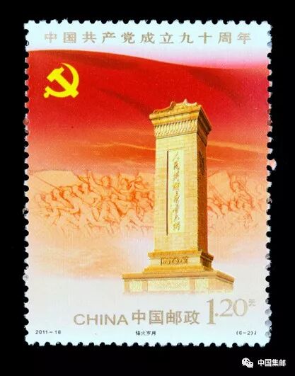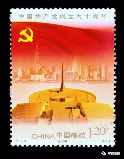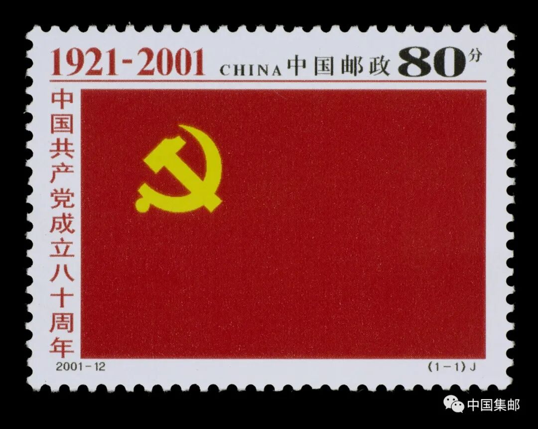 中国共产党党徽为镰刀和锤头组成的图案,党旗则是缀有金黄色党徽图案的红旗。党徽和党旗作为一个政党的代表图案,在建党题材的邮票上屡见不鲜。这里我们只选择作为主要图案出现的邮票展现给大家。