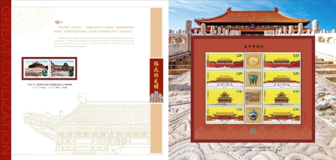 不过呈现故宫建筑之美的邮票因发行跨度年限较大,不容易收集完整,所以时值2020年“紫禁城建成600周年暨故宫博物院成立95周年”之际,中国集邮总公司隆重推出了《伟大的文明》邮票珍藏册。