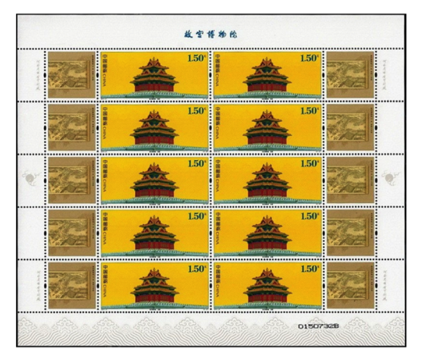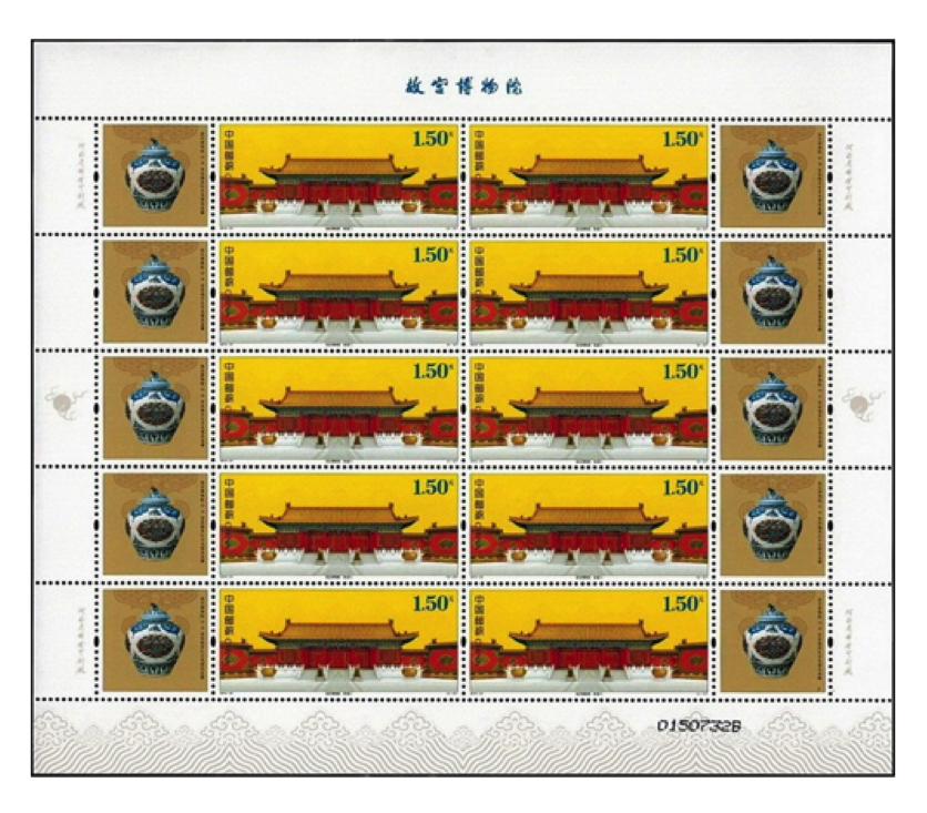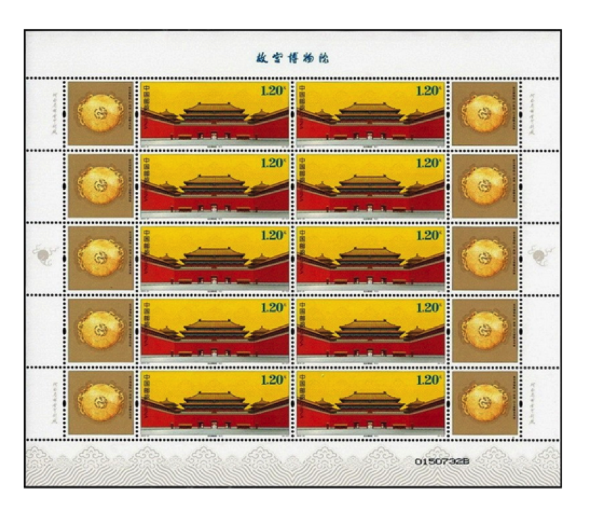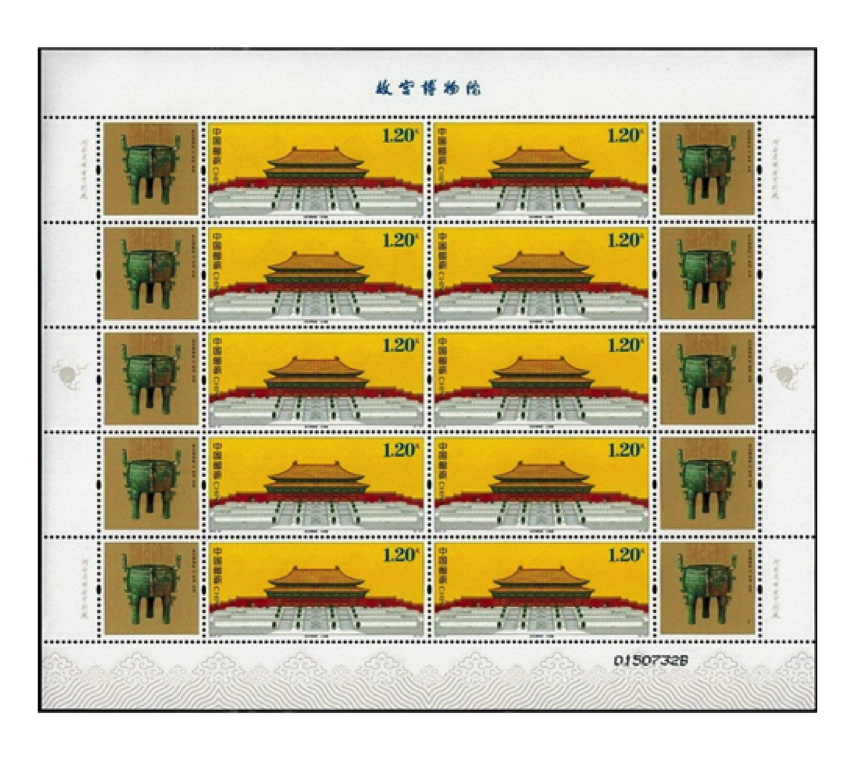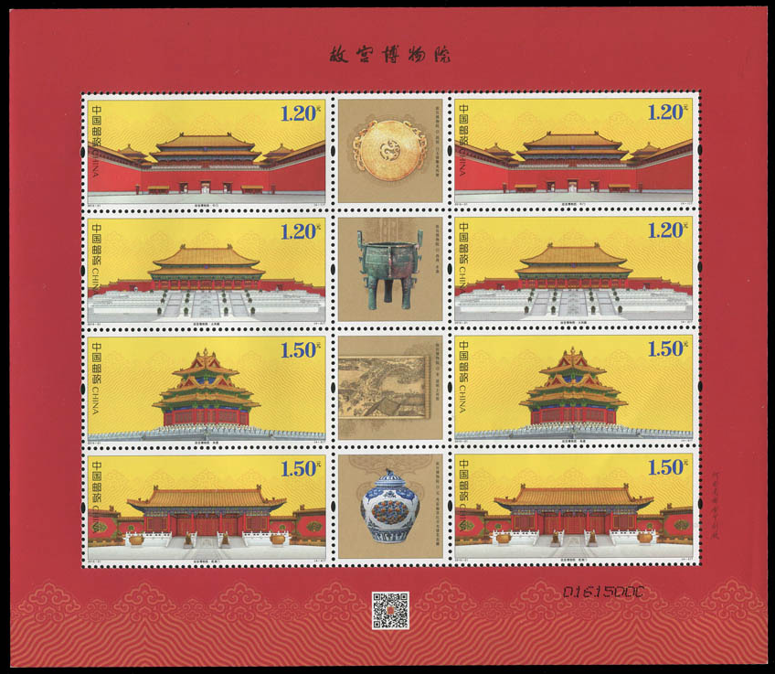 内含:《故宫博物院(二)》小型张、版式一、版式二,2015-21《故宫博物院》版式一、版式二,J120《故宫博物院建院六十周年》套票,1998-20《故宫和卢浮宫(中法联合发行)》套票, 《紫禁呈祥》特殊工艺2枚版个性化邮票。