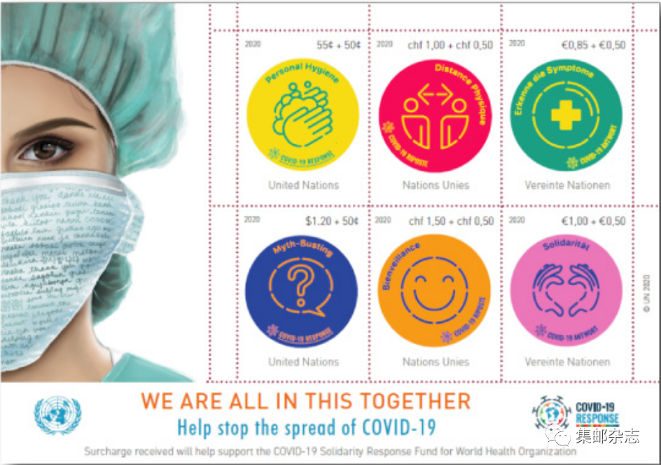 联合国邮政将于7月24日发行“团结一致抗击新型冠状病毒疫情”邮票一套6枚,该套邮票为附捐邮票。6枚邮票的主题和面值为“个人卫生”(面值0.55美元+0.5美元)、“传言和事实”(面值1.20美元+0.5美元)、“物理距离”(面值1瑞士法郎+0.5瑞士法郎)、“传递爱心”(面值1.50瑞士法郎+0.5瑞士法郎)、“了解症状”(面值0.85欧元+0.5欧元)和“团结一致”(面值1欧元+0.5欧元)。联合国邮政发行该套邮票的以支持世界卫生组织启动的“COVID-19团结应对基金”。销售邮票所得的附捐款项将全部用于新冠病毒的防疫工作。届时,《集邮》杂志微店也将为大家上架该套邮票及相关邮品。