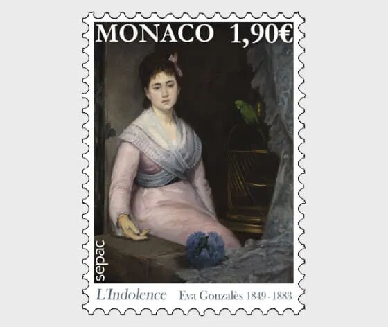 2020年6月25日,摩纳哥邮政发行一枚SEPAC欧洲小国邮政联盟系列邮票,主题为王宫收藏的印象派女画家伊娃·冈萨雷斯(Eva Gonzales,1849.4.19-1883.5.6)的作品。她的老师是著名的印象派画家爱德华·马奈,她是马奈唯一正式的学生。伊娃的绘画风格一直受到马奈画风的强烈影响,直到1872年,她才终于形成了自己的风格。