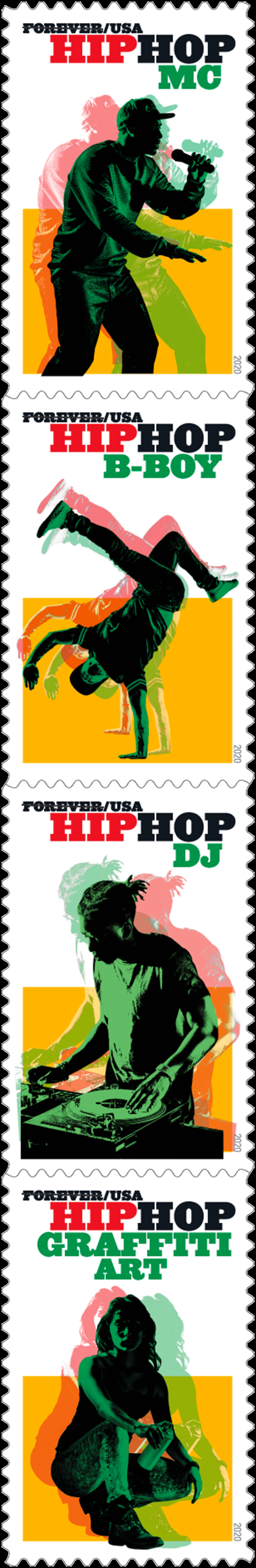 2020年7月1日,美国邮政发行一套四枚《嘻哈艺术》邮票。嘻哈艺术是一种源自非洲原始部落的流行文化。它首先在纽约市市区的非裔及拉丁裔青年之间兴起,继而发展壮大,并席卷全球。这四枚邮票展示了嘻哈文化的四个主要组成部分:说唱、DJ、涂鸦和霹雳舞。