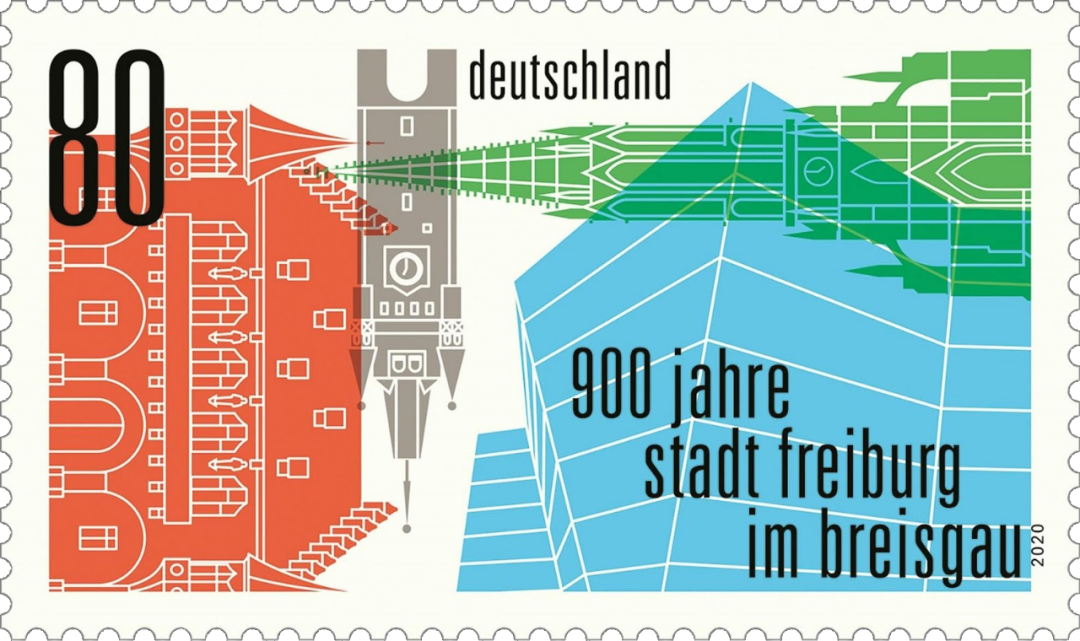 2020年7月2日,德国邮政为弗莱堡建城900周年发行一枚纪念邮票。弗莱堡位于德国西南边陲,靠近法国和瑞士,是德国巴登-符腾堡州的直辖市,弗莱堡大行政区的首府。