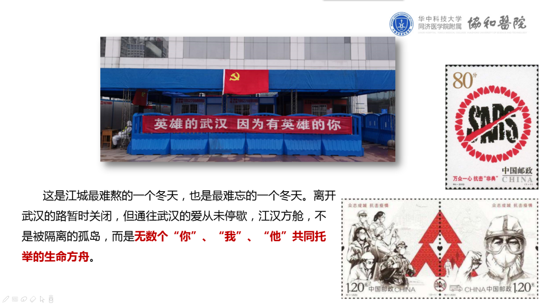 6月30日,湖北省邮政分公司集邮与文化传媒部党支部举办了一堂特殊的党课。大家认真观看、学习的党课课件由武汉协和医院党委副书记、江汉方舱医院院长孙晖制作,课件以“我的战‘疫’”为题,展示了江汉方舱34天的战疫故事。