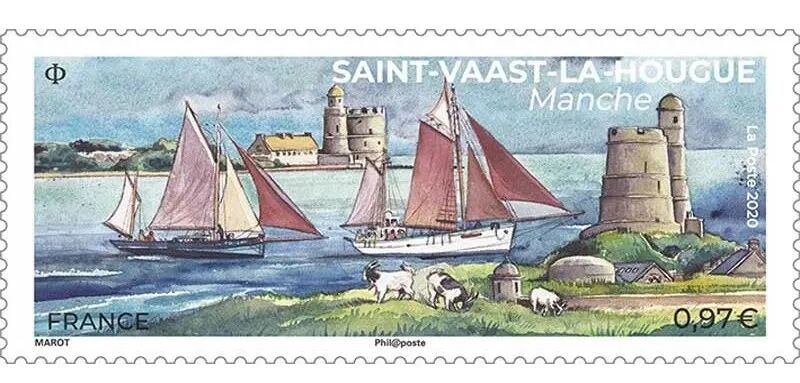 2020年7月6日,法国邮政发行一枚邮票,介绍2019年“法国人最喜欢的小镇”评选中的冠军—诺曼底的圣瓦阿斯拉乌盖(Saint-Vaast-la-Hougue)。这个小镇人口约两千人左右,是著名的生蚝之乡。