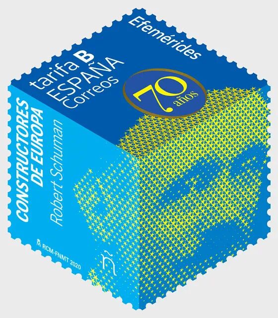 2020年7月2日,西班牙邮政为舒曼计划七十周年发行一枚纪念邮票。罗伯特·舒曼(Robert Schuman,1886年6月29日-1963年9月4日)是一位法国政治家,曾担任法国外交部长,1950年,他提出舒曼计划,为欧盟的前身—欧洲煤钢共同体的建立铺平了道路。他和让·莫内一起被称为“欧盟之父”。他也是欧洲议会的第一任议长。