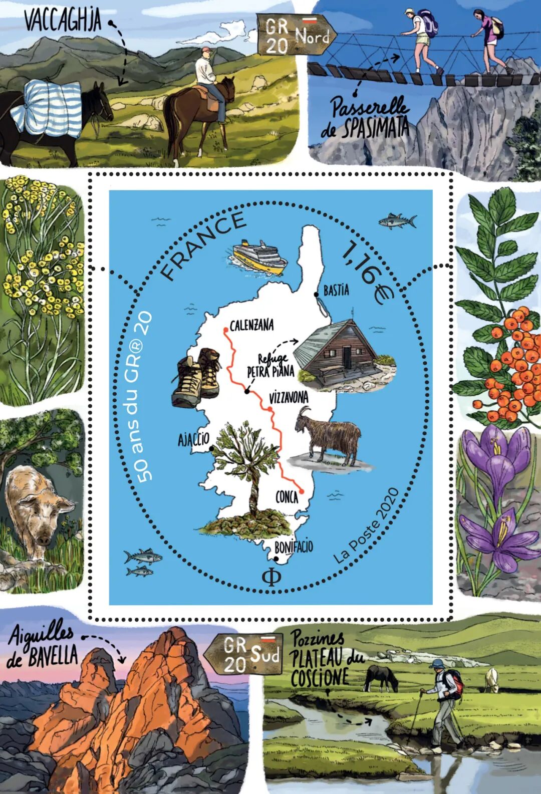 2020年6月29日,法国邮政发行一枚小型张,介绍科西嘉岛著名的GR20长途步道。GR20是一条从北到南对角线穿过法国科西嘉岛的长途步道。GR20艰苦跋涉的总距离为180公里长,分为北部和南部半段,前者更难。