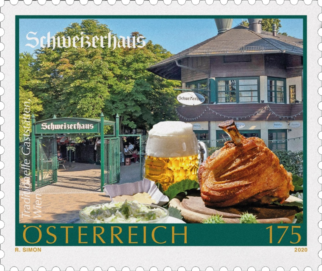 2020年7月3日,奥地利邮政发行一枚《传统美食》邮票,主题为斯威瑟豪斯餐厅的烤猪肘子。这里的烤猪肘子很有名气,外酥里嫩,不肥腻,两斤多的一个猪肘子,看着不大,其实是超大一块,外面的皮已经烤焦至脆了。