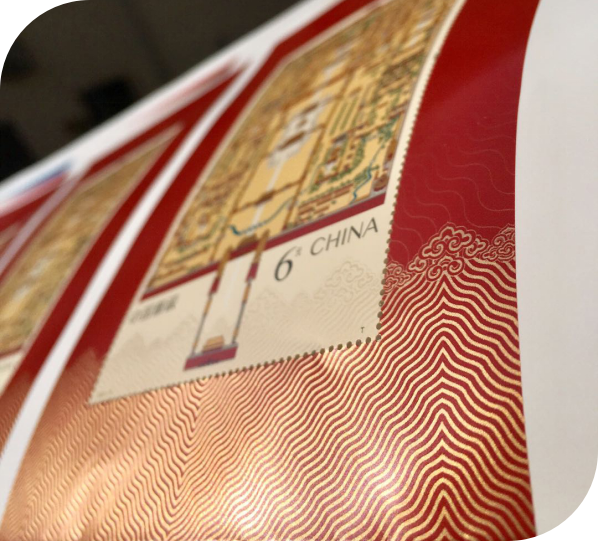 小型张采用高网线影写版印刷,黄、红、蓝、无色变金色珠光、金、黑六色印制。线条极致精细清晰,颜色套印精准,在放大镜下能够感受到特别的震撼。当放大到0.1mm的范围时,我们可以看到清晰的网点和锐利的细线。方寸之中,自有天地。