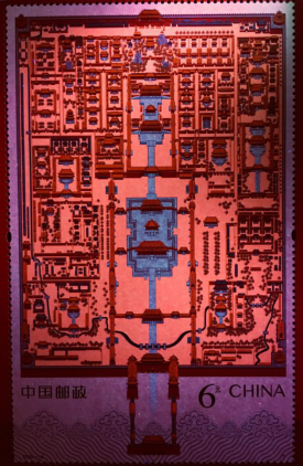 小型张采用特种金油墨印制纹饰图案,烘托故宫的尊贵大气。在故宫平面示意图中的地面部分,专门覆盖了一层无色变金色珠光油墨和荧光油墨,在特定光照和角度下观看,地面与建筑层次分明。