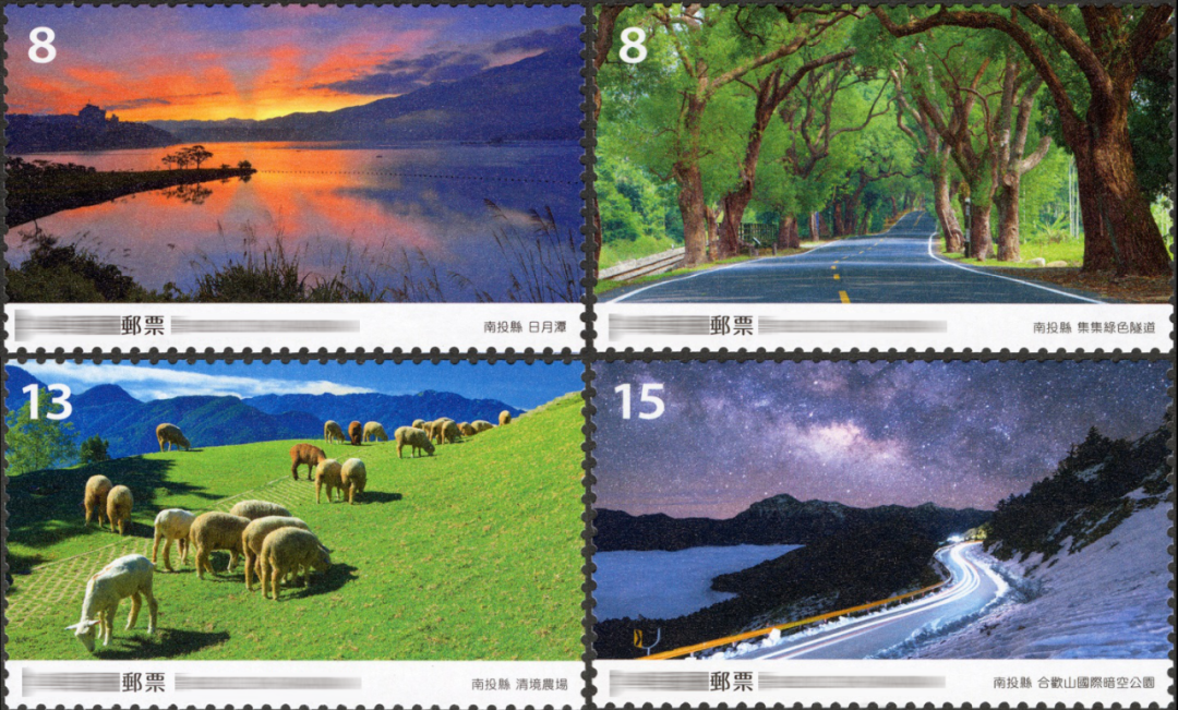8月12日,发行“宝岛风情邮票-南投县”一套4枚,图案及面值分别为:日月潭 (8元), 集集绿色隧道 (8元),清境农场 (13元),合欢山国际暗空公园 (15元)。
