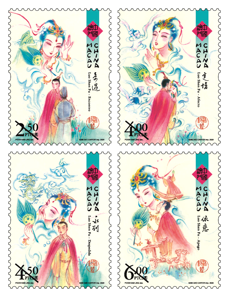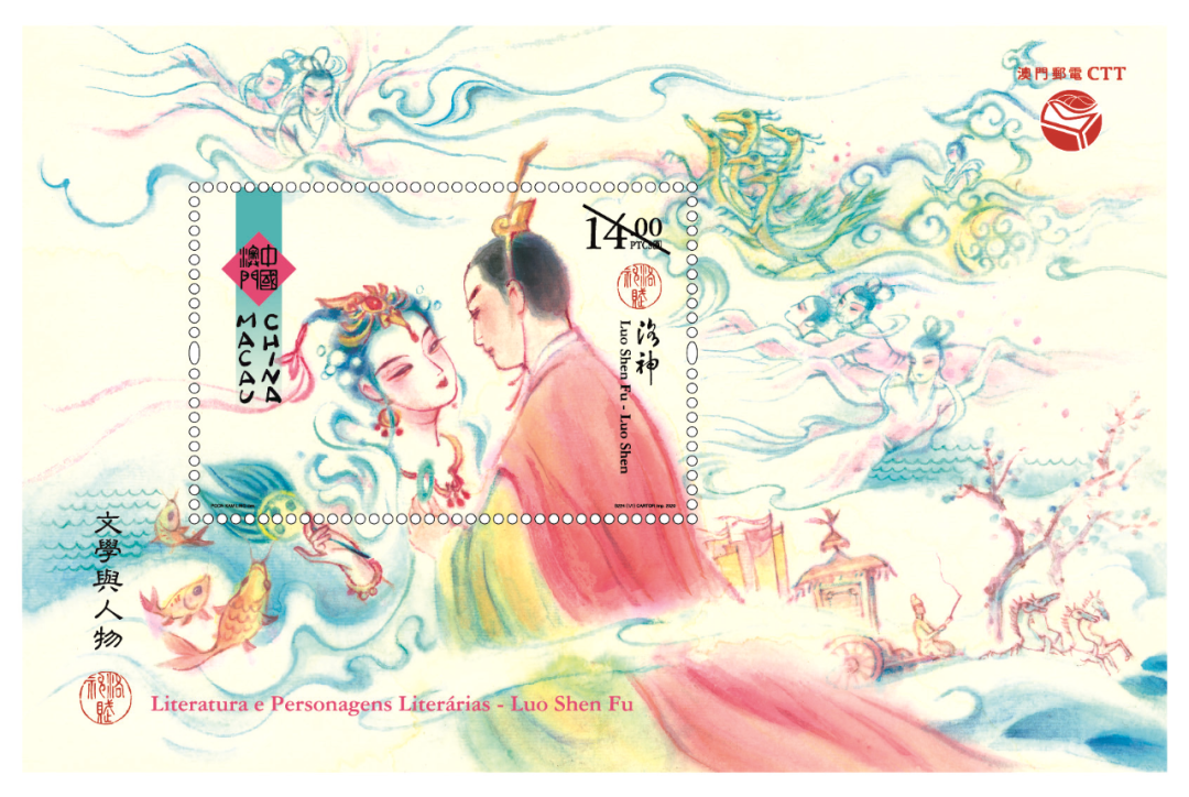 8月10日,发行《文学与人物 – 洛神赋》邮票一套4枚,图案及面值分别为:奇迹(2.50元),定情(4元),永别(4.50元),依恋(6元)。同时推出小型张1枚,图案为洛神,面值14元。