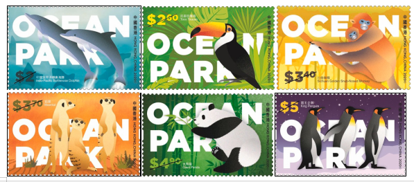 8月18日,发行《香港主题公园 – 香港海洋公园》邮票一套6枚,同时推出小型张1枚。图案及面值分别为: 印度太平洋樽鼻海豚(2元)、托哥巨嘴鸟(2.60元)、川金丝猴(3.40元)、狐獴(3.70元)、大熊猫(4.90元),以及国王企鹅(5元)。邮票小型张将海洋公园呈现于眼前,洋溢欢乐的气氛,面值10元。