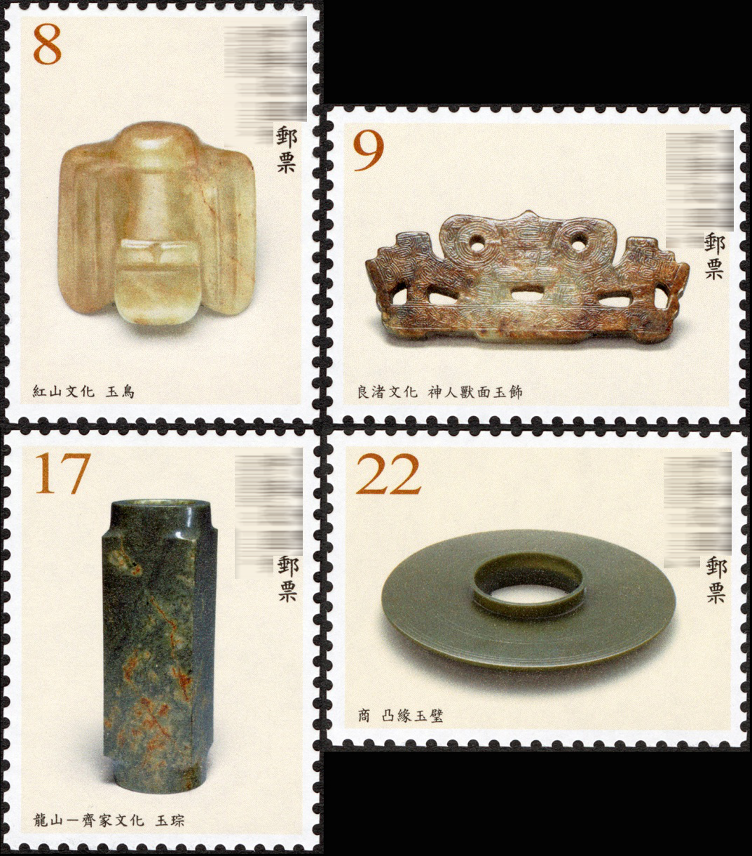 8月26日,发行“故宫玉器邮票(续2)”一套4枚,图案及面值分别为:红山文化 玉鸟 (8元), 良渚文化 神人兽面玉饰 (9元),龙山-齐家文化 玉琮(17元),商 凸缘玉璧 (22元)。