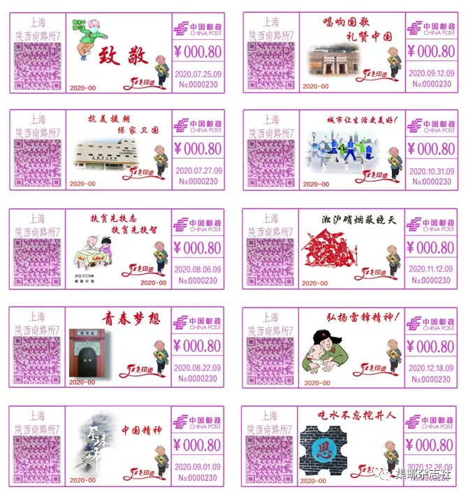 经中国邮政集团有限公司批准,上海市陕西南路邮政所将陆续启用“红色印迹”邮资机宣传戳第三组。本组邮资机宣传戳共计10枚。图案名称及启用时间分别为:“致敬”(7月25日)、“抗美援朝 保家卫国”(7月27日)、“扶贫先扶志 扶贫先扶智”(8月6日)、“青春梦想”(8月22日)、“中国精神”(9月1日)、“唱响国歌 礼赞中国”(9月12日)、“城市让生活更美好”(10月31日)、“淞沪硝烟蔽晓天”(11月12日)、“弘扬雷锋精神”(12月18日)和“吃水不忘挖井人”(12月26日)。