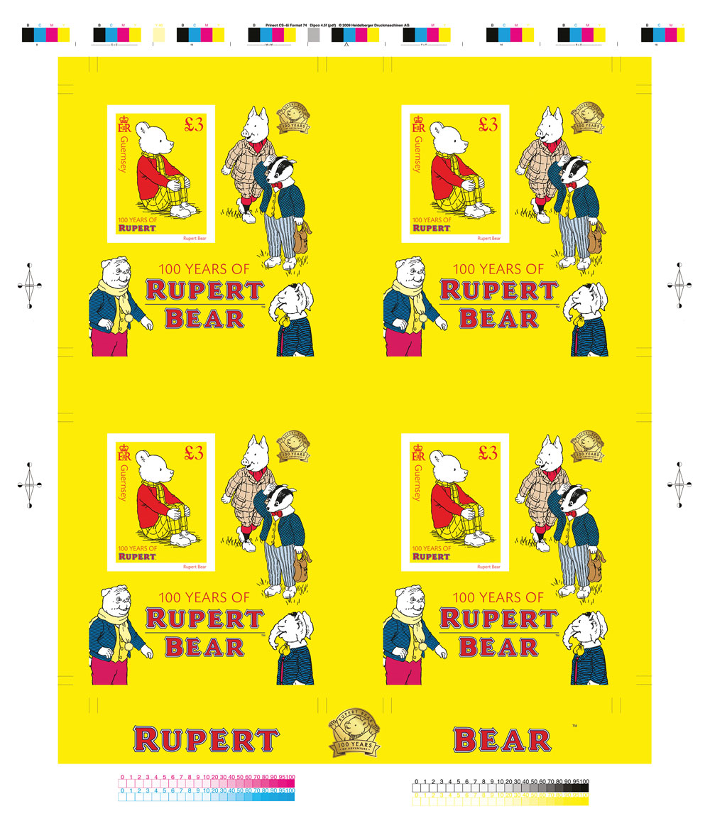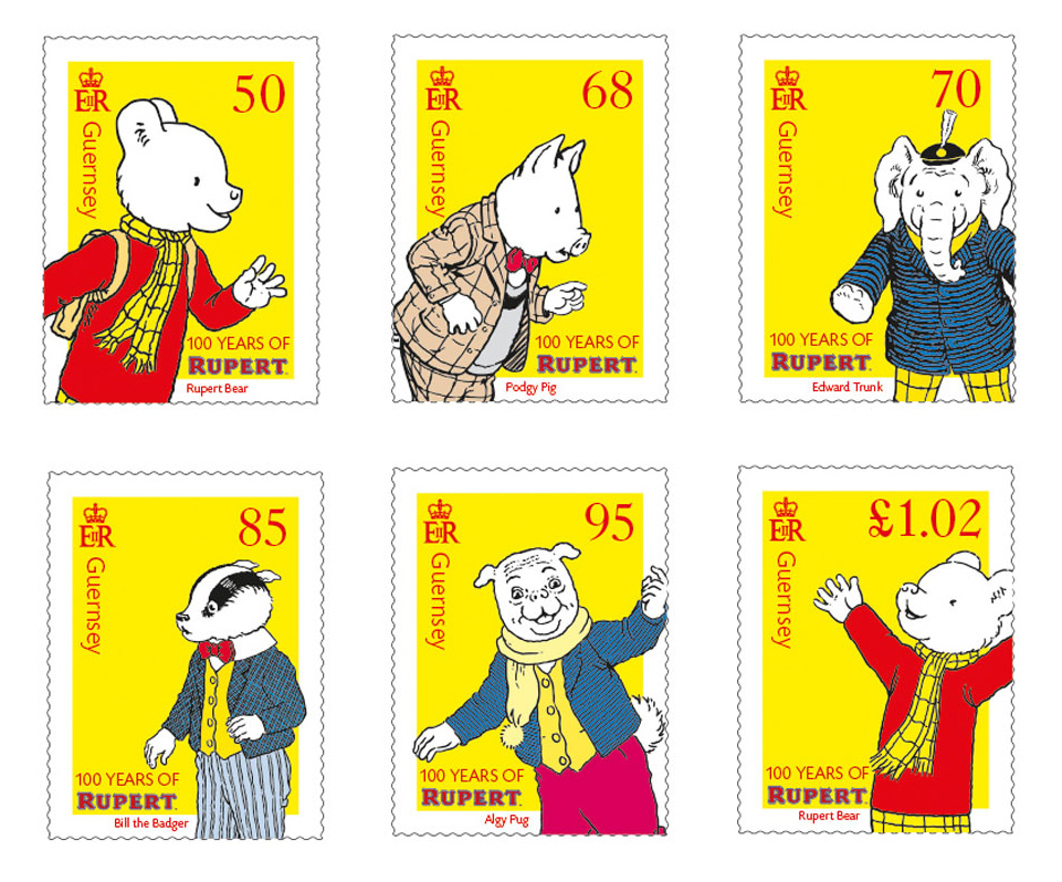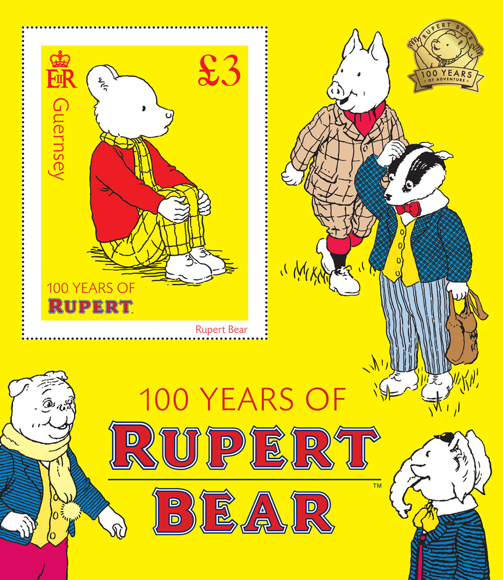 本次发行的邮票和小型张展示了“鲁珀特熊”和该系列漫画中的其它形象。根西岛邮政还在同日推出包含4枚小型张的限量款未裁切无齿孔大版,发行量仅300版。