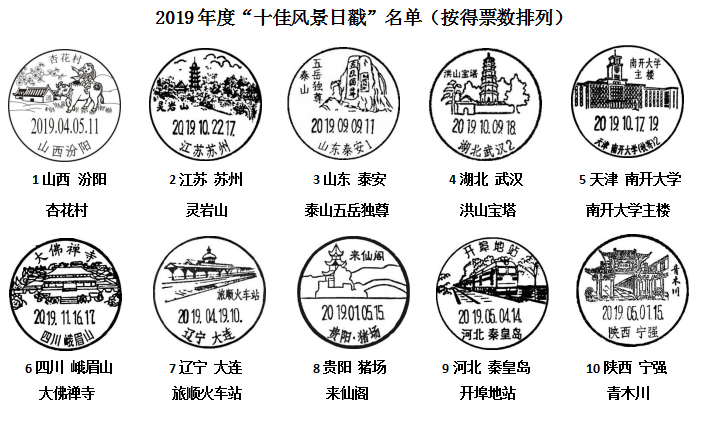 被评为2019年度“十佳风景日戳”的10枚风景日戳分别是:山西汾阳的“杏花村”、江苏苏州的“灵岩山”、山东泰安的“泰山五岳独尊”、湖北武汉的“洪山宝塔”、天津南开大学的“南开大学主楼”、四川峨眉山的“大佛禅寺”、辽宁大连的“旅顺火车站”、贵州贵阳猪场的“来仙阁”、河北秦皇岛的“开埠地站”和陕西宁强的“青木川”。