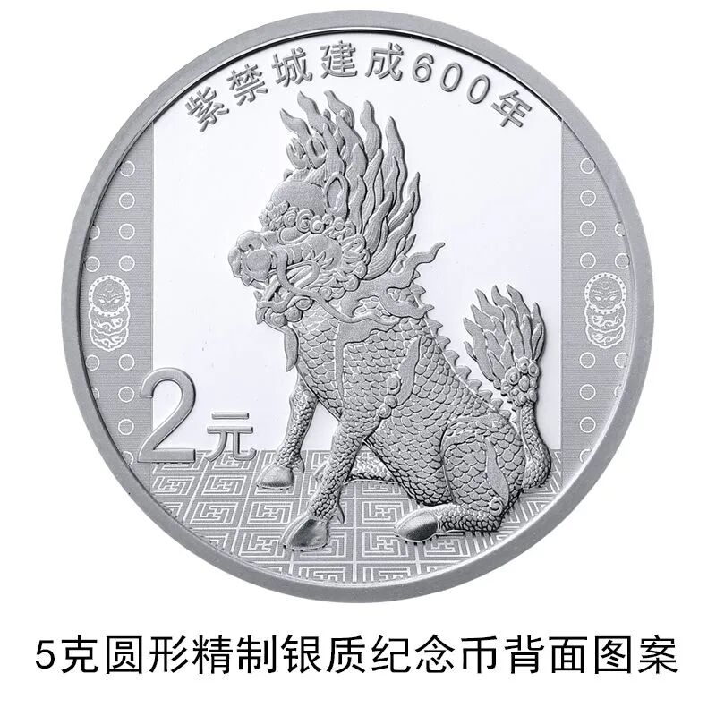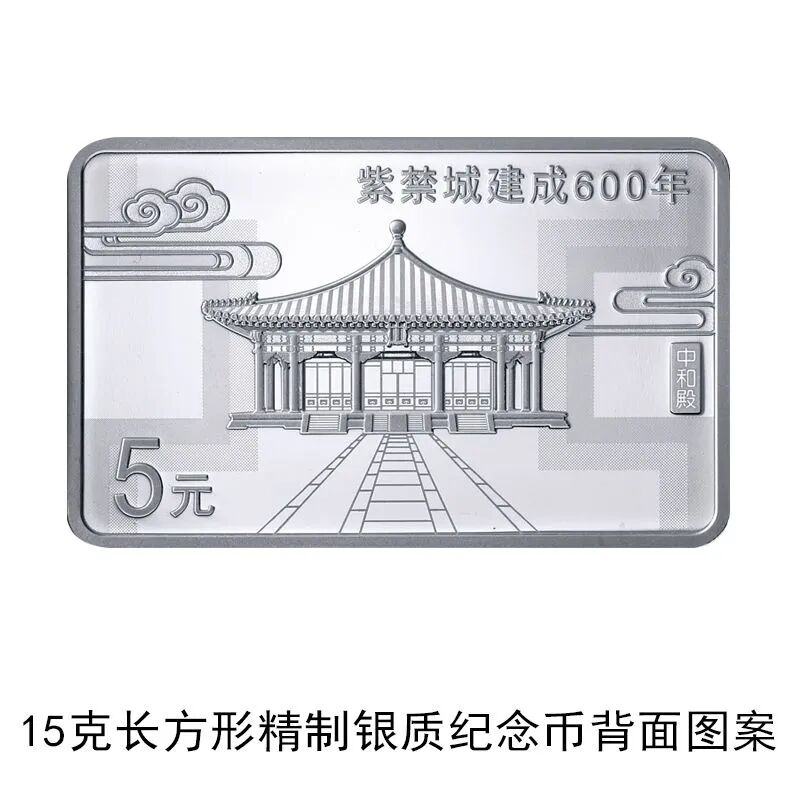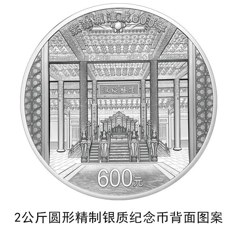 中国人民银行定于8月3日发行紫禁城建成600年金银纪念币一套。该套纪念币共计7枚,金质纪念币2枚,银质纪念币5枚,背面图案包含紫禁城俯瞰全景、故宫三大殿等图案,并刊有“紫禁城建成600年”文字。其中1公斤金质纪念币1枚,面额10000元,成色99.9%,最大发行量100枚,被称为“紫禁城最贵地图”。