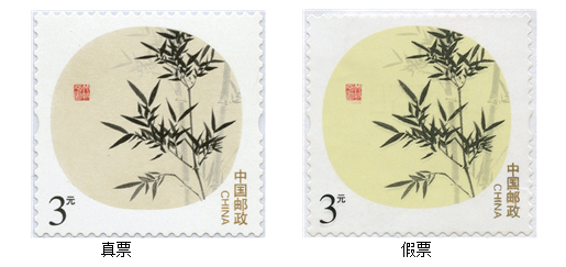 假票为胶版,印刷网点明显,做工粗糙,图案文字模糊,刷色比真票偏黄。
