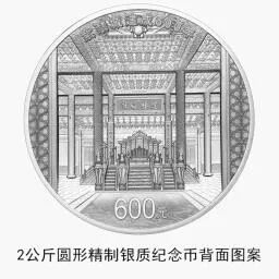 2公斤圆形银质纪念币,面额600元,直径130毫米,最大发行量3000枚,背面图案采用太和殿内景。这也是本次发行的最大规格的银质纪念币,采用太和殿内景局部图案,对九龙金漆宝座、贴金盘龙大柱,进行了十分形象、细致的雕琢。太和殿既是紫禁城最大形制的宫殿,也是紫禁城建成后明清两代权利中心的象征,具有非常特殊的历史价值。通过在纪念币中镌刻太和殿,能很好的借用纪念币这个特殊的载体把紫禁城文化传递给全世界,彰显中华民族的文化自信。
