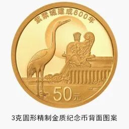 3克圆形金质纪念币,面额50元,直径18毫米,最大发行量6万枚,背面图案采用铜鹤和大吻形象。铜鹤图案取材于太和殿前广场上伫立的铜鹤。在中国文化中,鹤代表着仙风道骨的精神品格,与神格化的龟身兽一起,则寓意“龟鹤千秋,万寿无疆”。铜鹤背后的大吻,是紫禁城建筑中的重要部件,起到防水、装饰等多重作用,太和殿的大吻更是目前我国现存最大的大吻。把铜鹤与大吻作为金币上的图案,代表了中国人高洁的品格与中国建筑文化的传承。